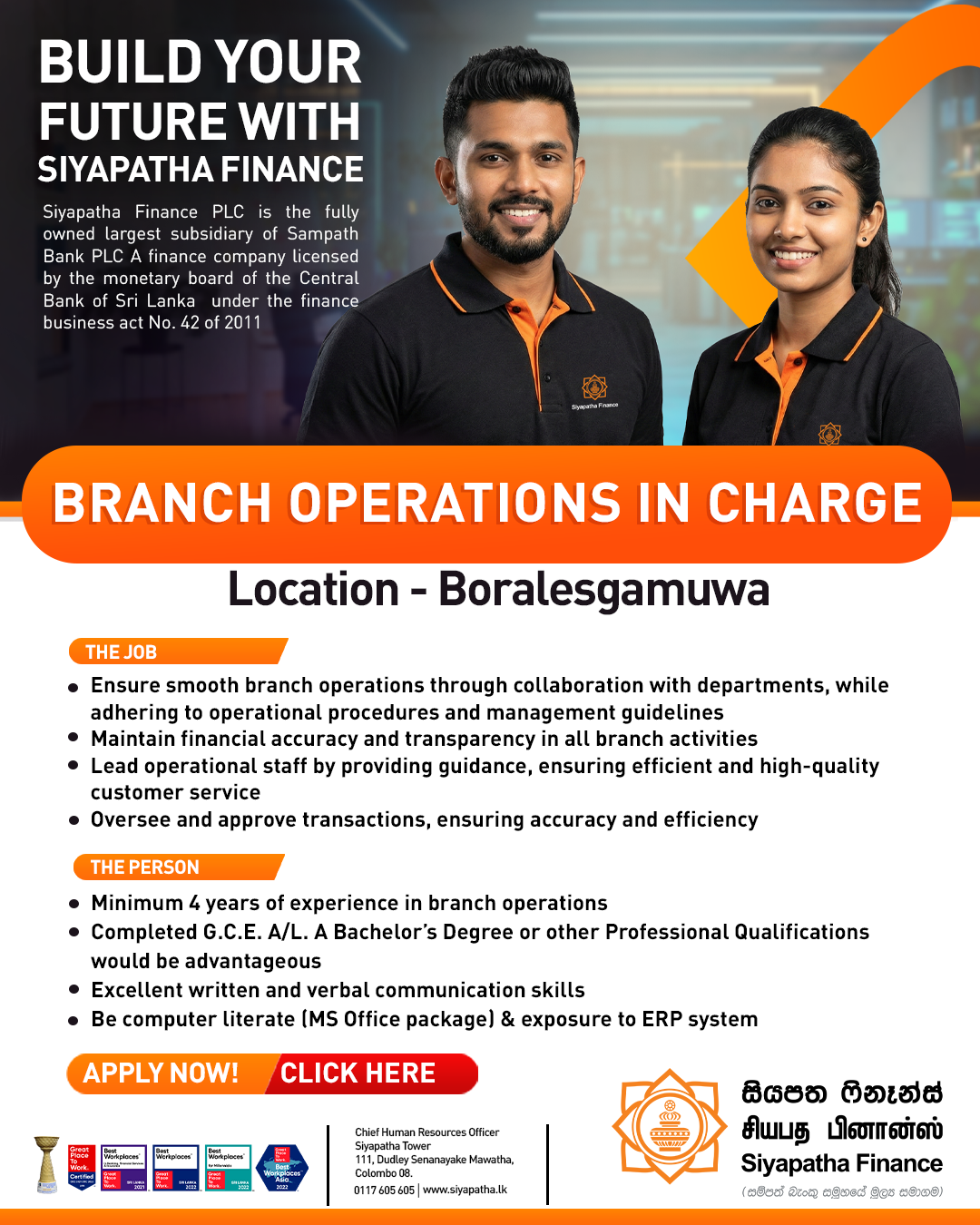 Siyapatha Finance is a direct reflection of its people and recognizes its human capital as its most valuable asset. Directed by an inspiring leadership style and built on sustained excellence and best people working smart, Siyapatha’s culture is nothing short of spectacular. Our unmatched performance as a trusted financial partner in the country stands as a testament to our company-wide commitment to be the best in everything we do!